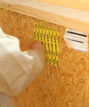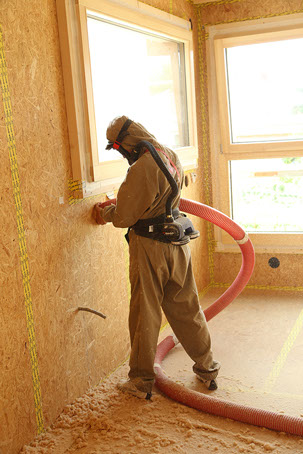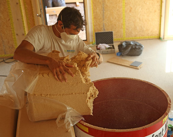 Afin de renforcer encore l'isolation des murs extérieurs, on pratique l’insufflation de fibre de bois à l'intérieur des caissons créés par la structure des murs et l'isolant extérieur.