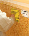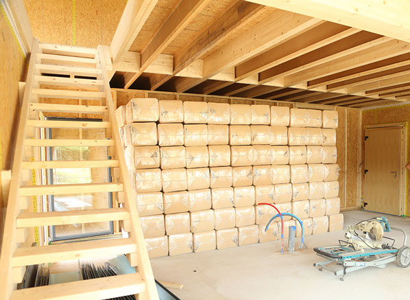 Afin de renforcer encore l'isolation des murs extérieurs, on pratique l’insufflation de fibre de bois à l'intérieur des caissons créés par la structure des murs et l'isolant extérieur.